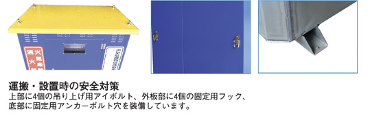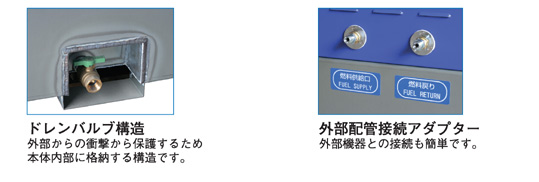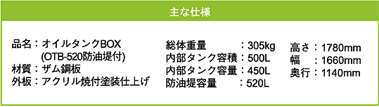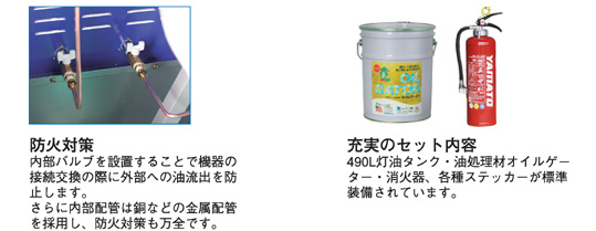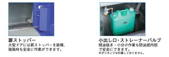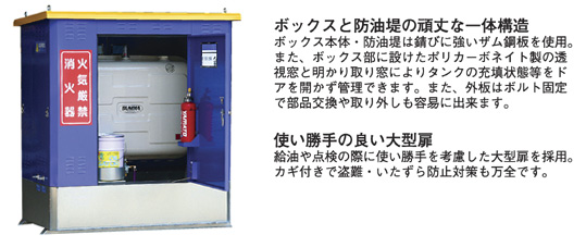 | オイルタンクと一体となった防油堤が万一の油類流出を未然に防ぎます。 また、緊急時に必要な油処理材、消火器もセット、環境被害を最小限にするため備えておけば安心です。 実用新案登録:登録番号3147996号 |