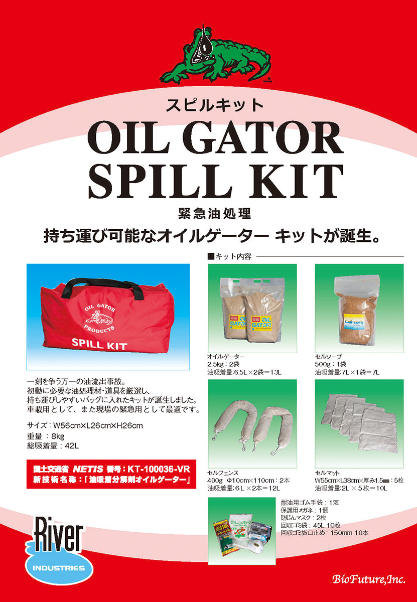 一刻を争う万一の油流出事故初動に必要な油処理材・道具を厳選し、持ち運びしやすいバッグに入れたキットが誕生しました。車載用として、また現場の緊急用として最適です。